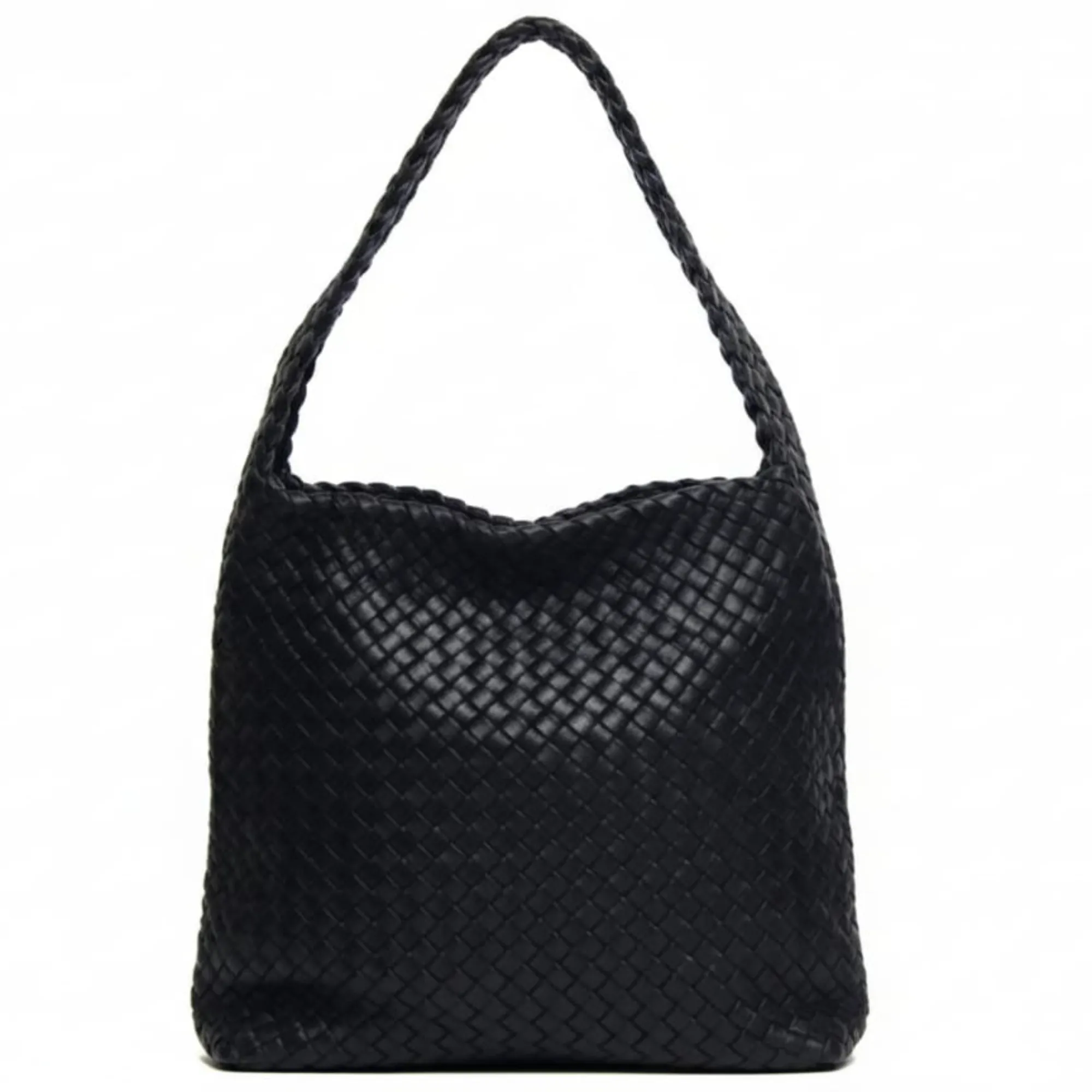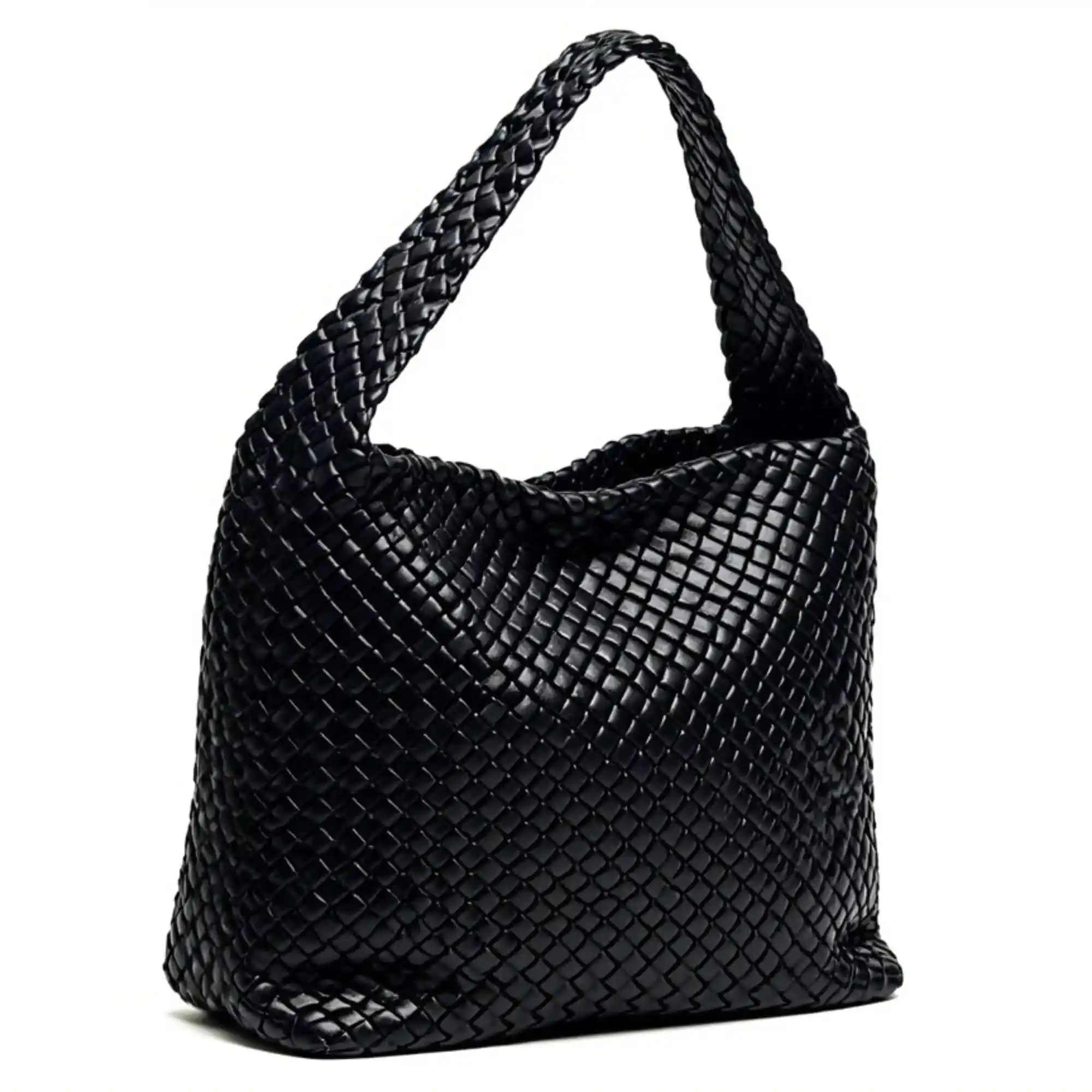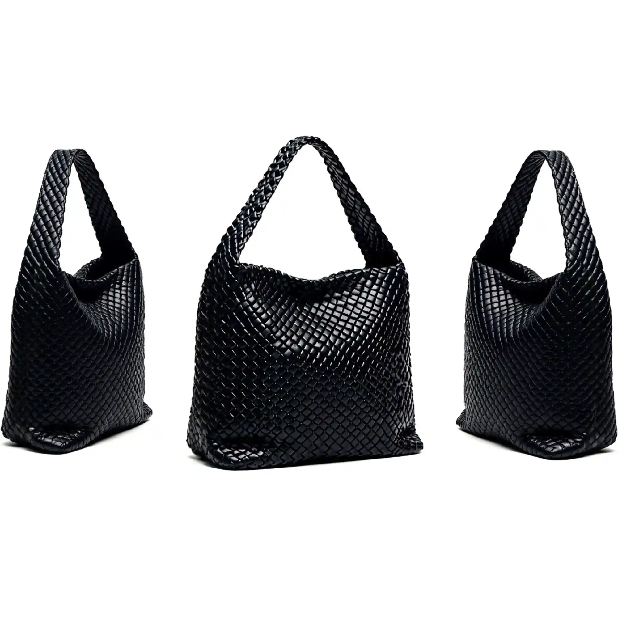 Black Aura Vine is a slouchy yet structured hobo bag in deep black woven leather, blending the enigmatic vibe of its “Aura” predecessor with vine-like texture for added organic allure. Its relaxed silhouette features generous drop handles for effortless shoulder carry and a softly draped body that molds to your essentials without bulk. Perfect for the modern minimalist seeking bohemian edge, it pairs seamlessly with casual denim or flowy dresses for day-to-night versatility.
