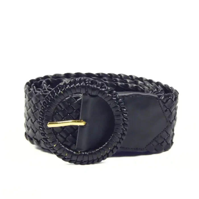 This black braided loop belt features a stylish woven leather design with a prominent circular gold buckle. It’s a versatile fashion accessory ideal for pairing with dresses, pants, or casual outfits, offering both elegance and adjustability without traditional prong holes. The double-strand braiding adds texture and a bohemian touch, made from high-quality leather .