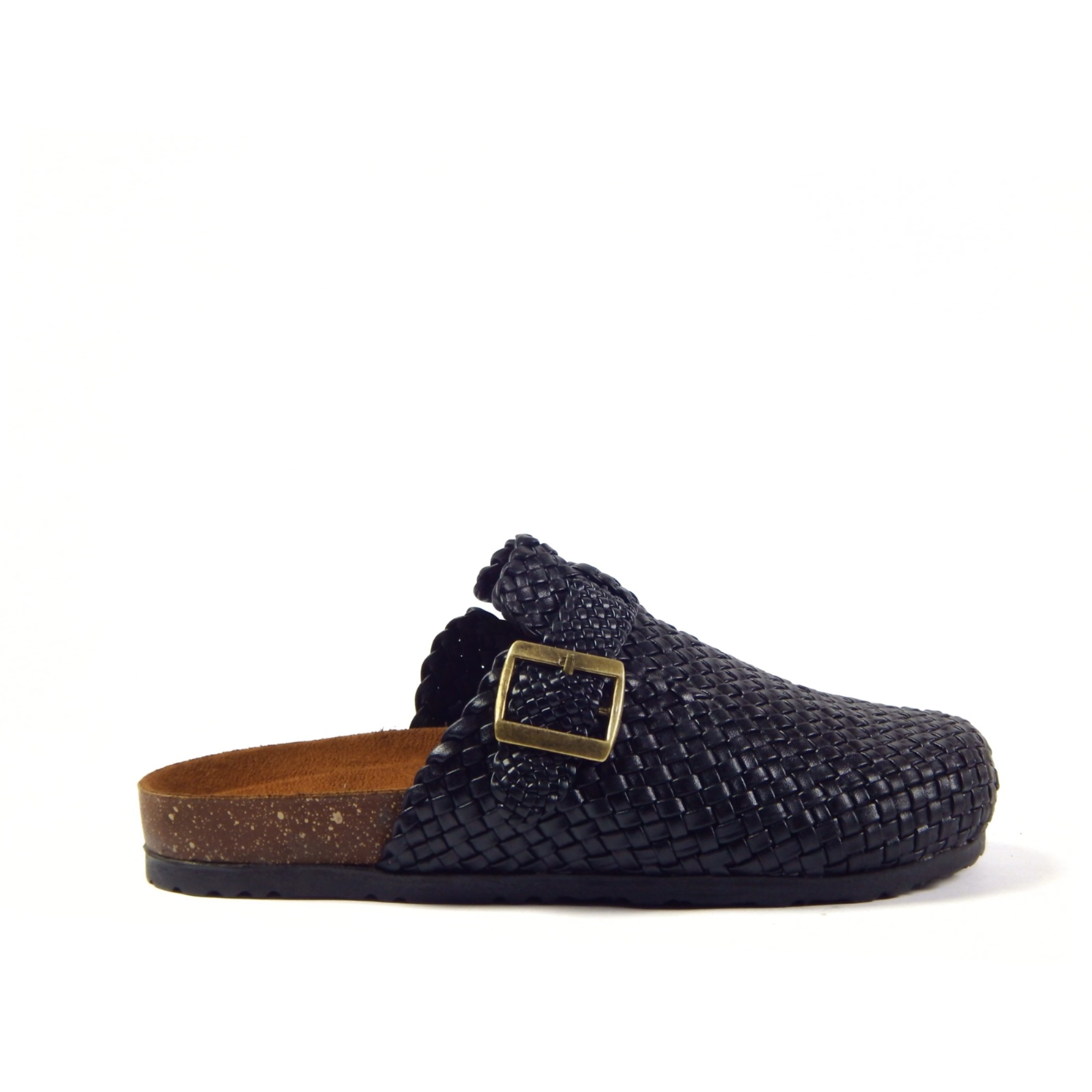 This clog combines a richly textured black woven upper with a statement buckle detail, creating a look that feels both relaxed and refined for everyday wear.