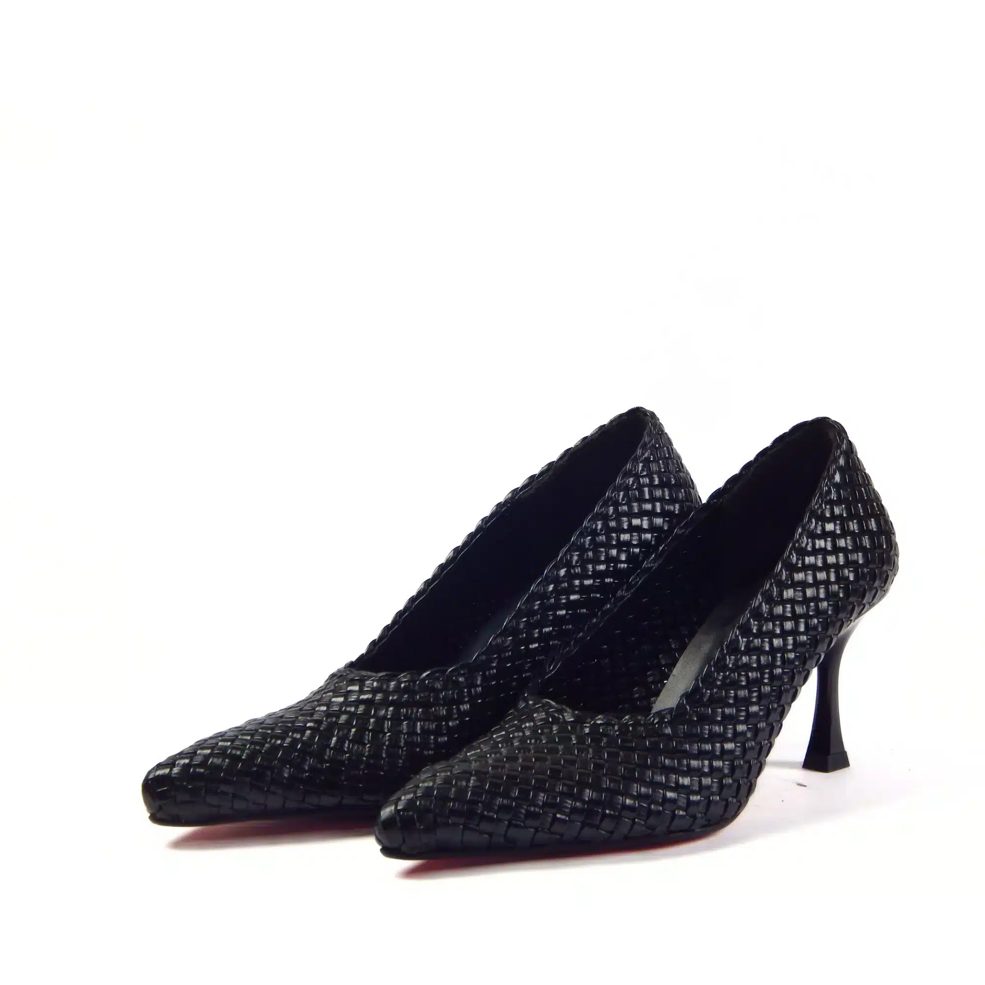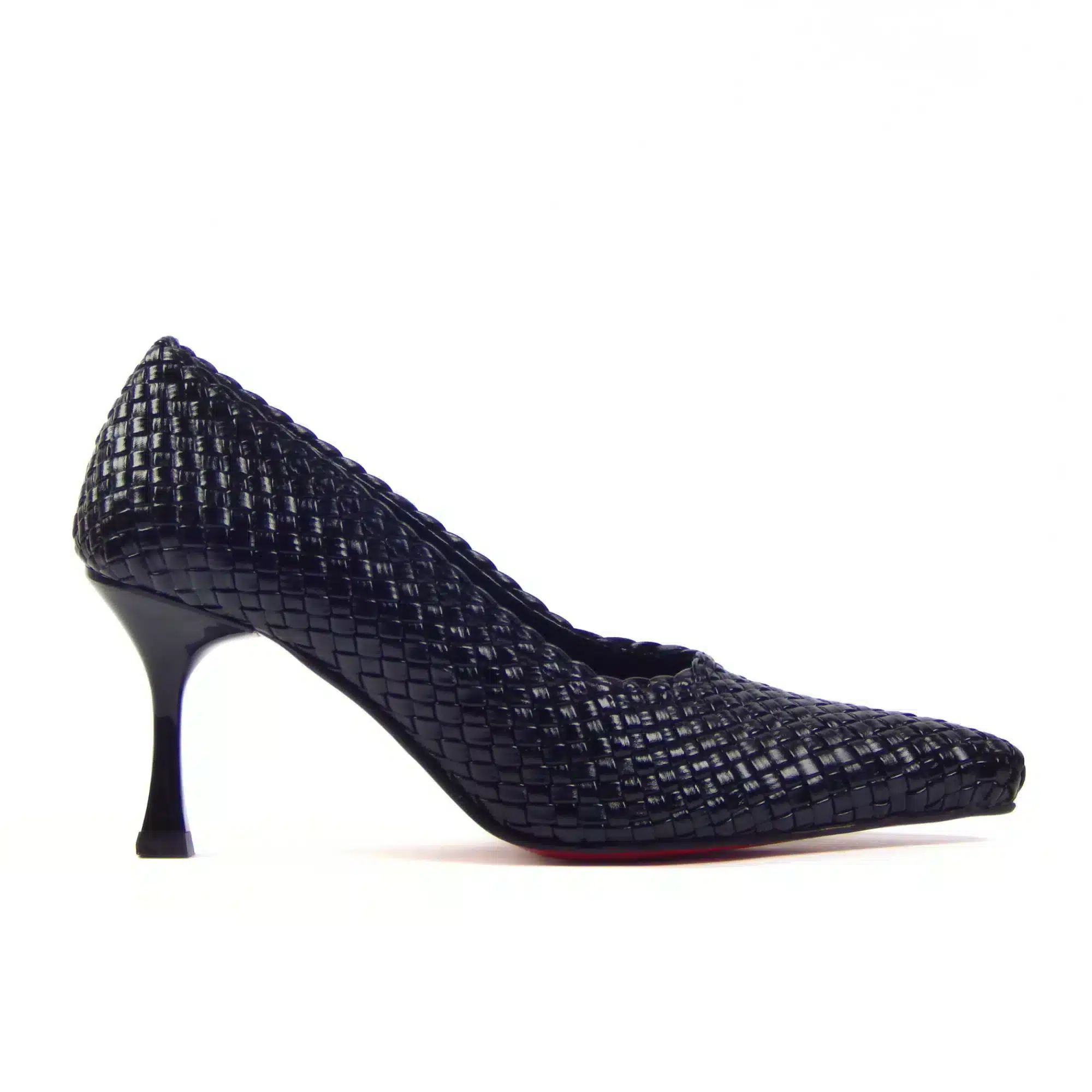 This heel features a sleek pointed-toe silhouette wrapped in a tightly woven black upper, creating a rich, textured finish while maintaining a refined, streamlined profile. The graceful mid-height heel adds just the right amount of lift while staying comfortable enough for long events, making it an easy choice for occasions that call for polish and confidence.